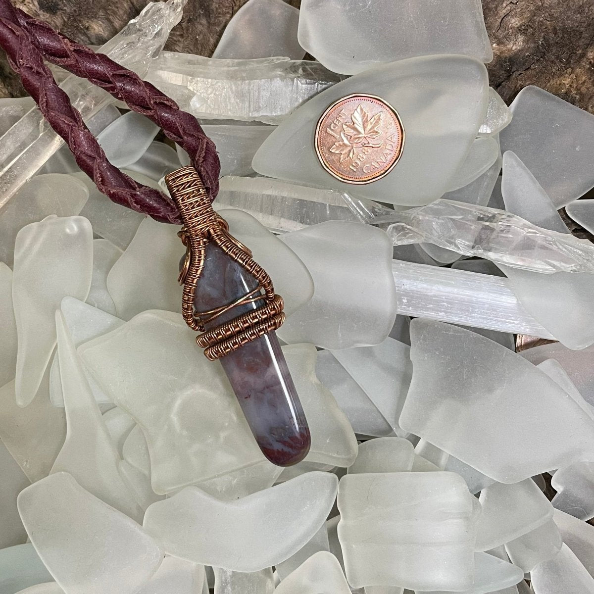 The beautiful red tones in this Bay of Fundy agate are complimented by the maroon of the hand-braided reclaimed leather lace. the pendant measures 2.75" tall and .75" wide and is secured in a copper weave that has been left bare to age naturally. It hangs from a 17" necklace and is reversible and unisex!